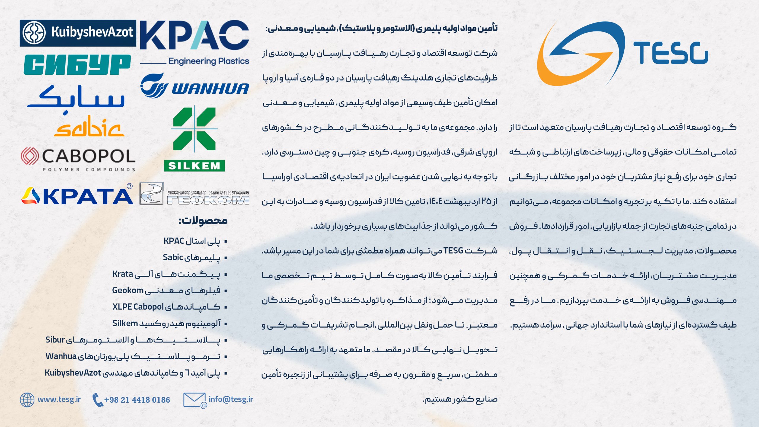 Today, the application of polymers has expanded significantly in comparison to metal and mineral materials, a trajectory that is expected to persist. Trade and Economy Solution Group (TESG), with its extensive experience in international markets, is poised to guide companies through the rapid development and expansion of polymer products. By creating value across the supply chain, TESG can provide tailored solutions to meet the specific needs of this dynamic industry.